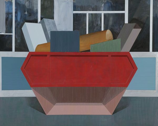 趙新宇作品當(dāng)中的圖式來源,無論是從攝影作品中或者裝置作品中抑或現(xiàn)實當(dāng)中選取某個場景的邊角,從某種程度上,均服從于他個人基于謹(jǐn)慎的、甚至敏感的內(nèi)在壓制,正如《室外2#容器》背景的窗框,稱其為窗框,倒不如把它當(dāng)作畫面整體結(jié)構(gòu)的一個同級邏輯走向,正如同置放在背景前的所謂“容器”當(dāng)中的幾何體,是幾何化了的現(xiàn)實物與根據(jù)畫面再行部分添加的合奏,在某種程度上,也可以說是塞尚繪畫理念的一則變異體。
