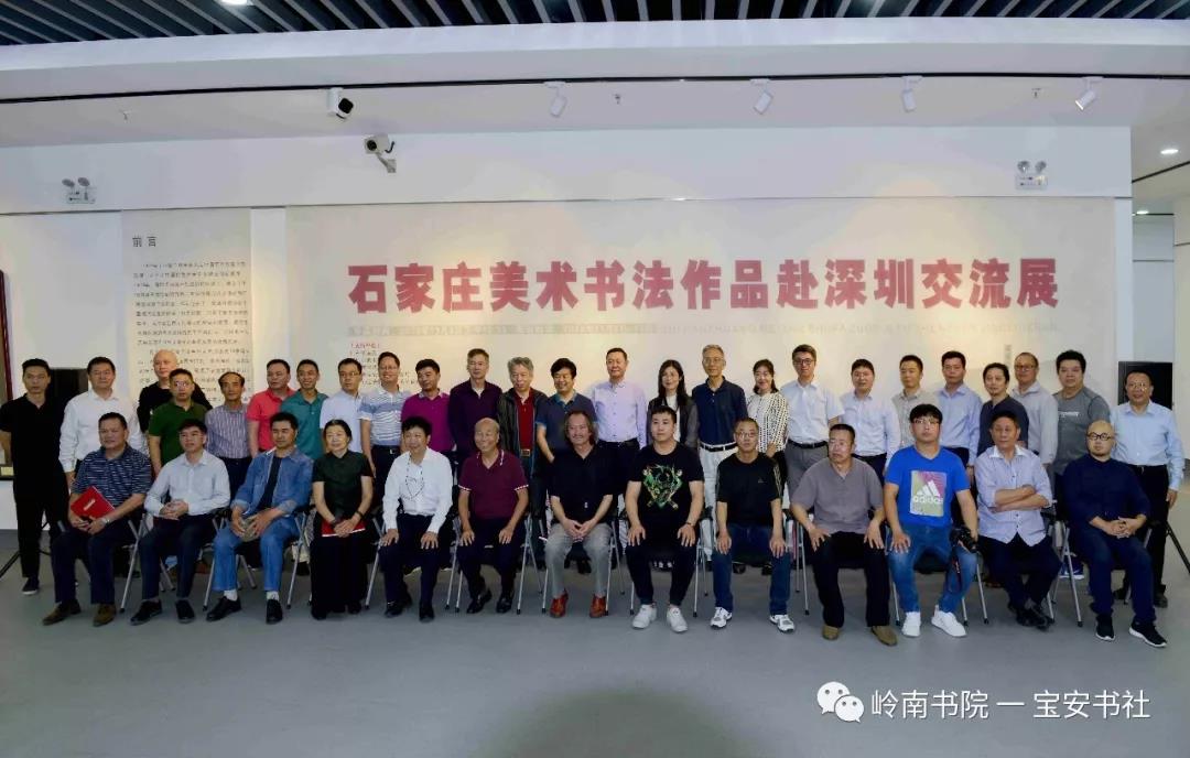 石家莊市與深圳市美術(shù)書法界的藝術(shù)家與參加開幕式的領(lǐng)導和嘉賓合影,石家莊美術(shù)書法作品赴深圳交流展成功開幕。