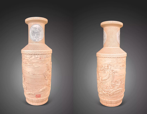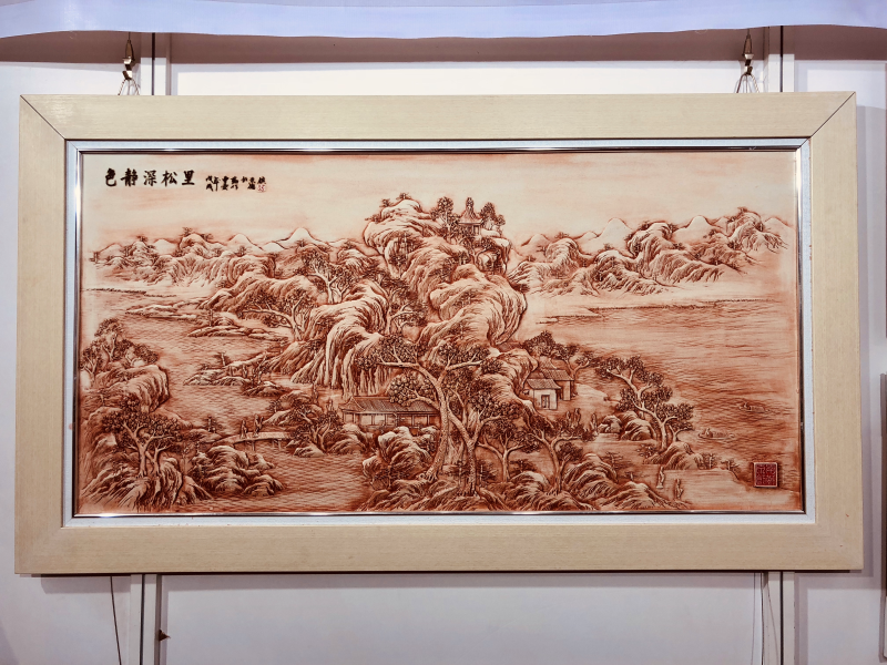 這是曹愛勤首次參加深圳文博會,帶來了她所創(chuàng)作的陶瓷、篆刻、書畫等多種形式的藝術(shù)作品,可以看到其不同形式作品的創(chuàng)作技法、主題、表現(xiàn)手法等均有較大差異,充分體現(xiàn)了曹愛勤在陶瓷藝術(shù)道路上追求卓越、勇于創(chuàng)新的新時代大國工匠精神。在其創(chuàng)作中,特別是作為中國陶瓷重要組成部分的陶瓷雕刻作品《色靜深松里》、《八仙過?!?,承載了國畫、雕刻、裝飾等綜合性藝術(shù)手法,每件作品都充分體現(xiàn)出工匠技能,堪稱學(xué)貫中西、熔鑄古今之珍品。