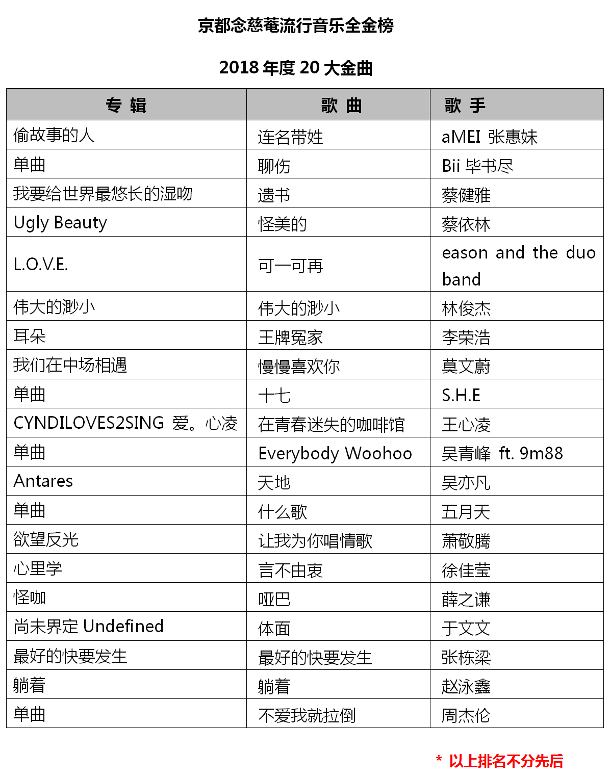 憑著專輯《垂直活著,水平留戀著。》主打歌曲《Forever Young》,在京都念慈菴·流行音樂全金榜榜單中霸榜十周的艾怡良,實(shí)力入圍“年度最受歡迎創(chuàng)作歌手”。除此外,毛不易、趙泳鑫、陳綺貞、蕭秉治、于文文、白安、王笠人均有入圍。