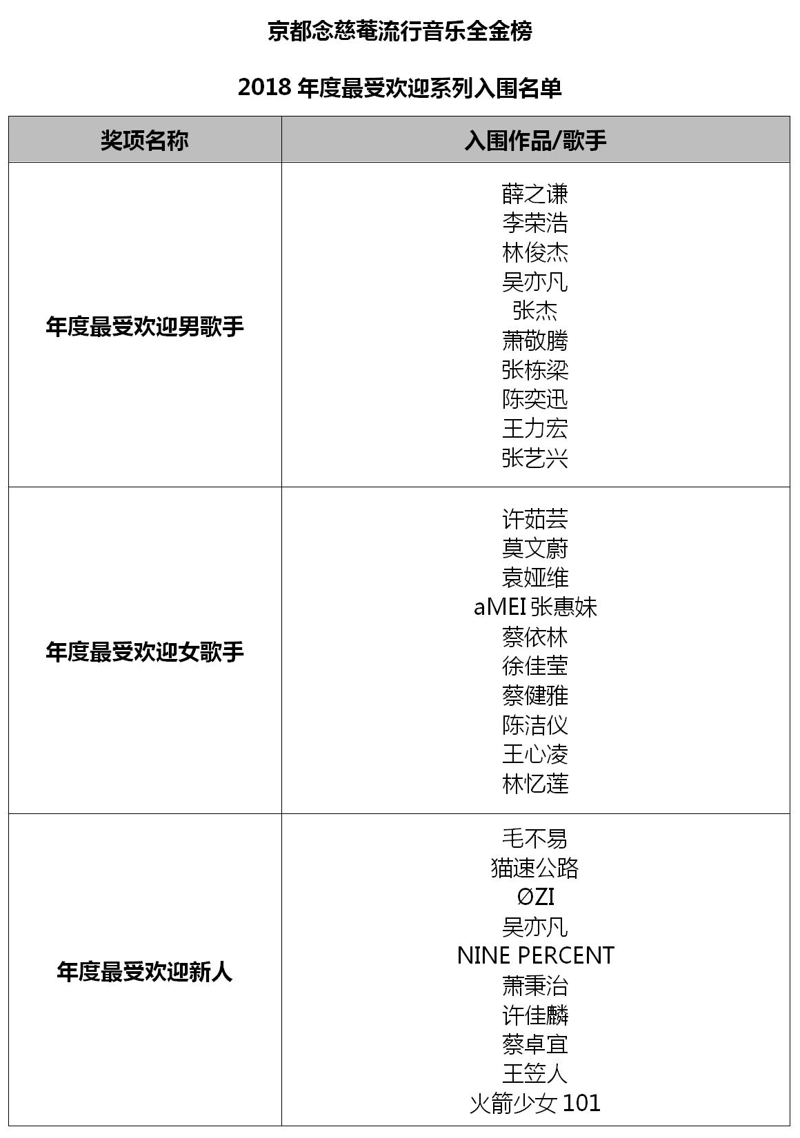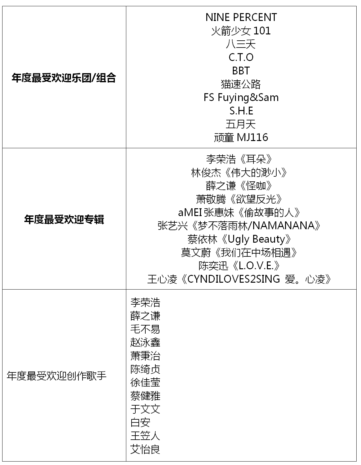 “年度最受歡迎樂隊(duì)/組合”入圍名單中,同在2018年成功舉辦巡回演唱會(huì)的五月天、S.H.E等老牌組合的進(jìn)榜,讓大家看到了華語(yǔ)樂壇常青樹的非凡音樂實(shí)力;八三夭、C.T.O、BBT、FS Fuying&Sam、頑童MJ116等組合,憑借不減反升的人氣魅力實(shí)力進(jìn)榜;而NINE PERCENT、火箭少女101及貓速公路等新人組合的二次入圍,不僅僅是對(duì)他們?cè)谝魳烦煽?jī)上的肯定,更是對(duì)其未來之路的鼓勵(lì)。