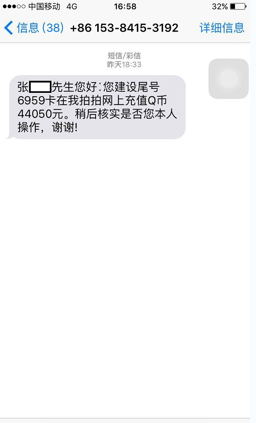 一天,客戶(hù)張先生收到一條手機(jī)號(hào)碼為15384153192發(fā)來(lái)的短信:“張先生您好∶您建設(shè)銀行尾號(hào)6959卡在我拍拍網(wǎng)上充值Q幣44050元,稍后核實(shí)是否您本人操作,謝謝!”起初,張先生見(jiàn)是陌生手機(jī)號(hào)發(fā)來(lái)的短信,就并未在意,可隨后卻收到建行95533客服中心發(fā)來(lái)的短信提醒,稱(chēng)他的銀行賬戶(hù)發(fā)生了一筆44050元的轉(zhuǎn)賬支取業(yè)務(wù)。