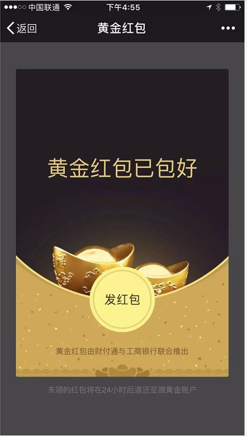 如果黃金紅包包好后未發(fā)送或未被領(lǐng)取,24小時(shí)后會(huì)自動(dòng)退回到發(fā)送用戶微黃金賬戶