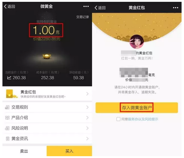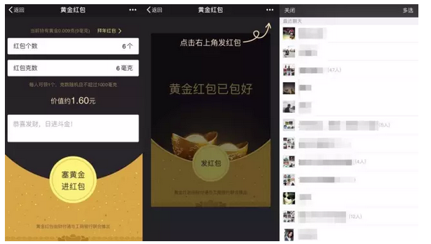 發(fā)紅包的人不再發(fā)送現(xiàn)金紅包,而是發(fā)送以黃金為主體的紅包,以毫克為單位計(jì)算……黃金紅包價(jià)值會(huì)隨著微黃金價(jià)格波動(dòng),微黃金報(bào)價(jià)跟蹤上海黃金交易所價(jià)格浮動(dòng)。收到黃金紅包的人實(shí)質(zhì)持有的為計(jì)量的黃金,并且可以根據(jù)當(dāng)前金價(jià)將其變現(xiàn)。
