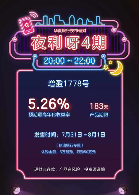 “夜市理財”是華夏銀行夜間發(fā)售的理財產品,投資者需要通過手機銀行等在線渠道購買。推出理財夜市,使朝九晚五的上班族,避免了錯失購買緊俏銀行理財產品的時機。