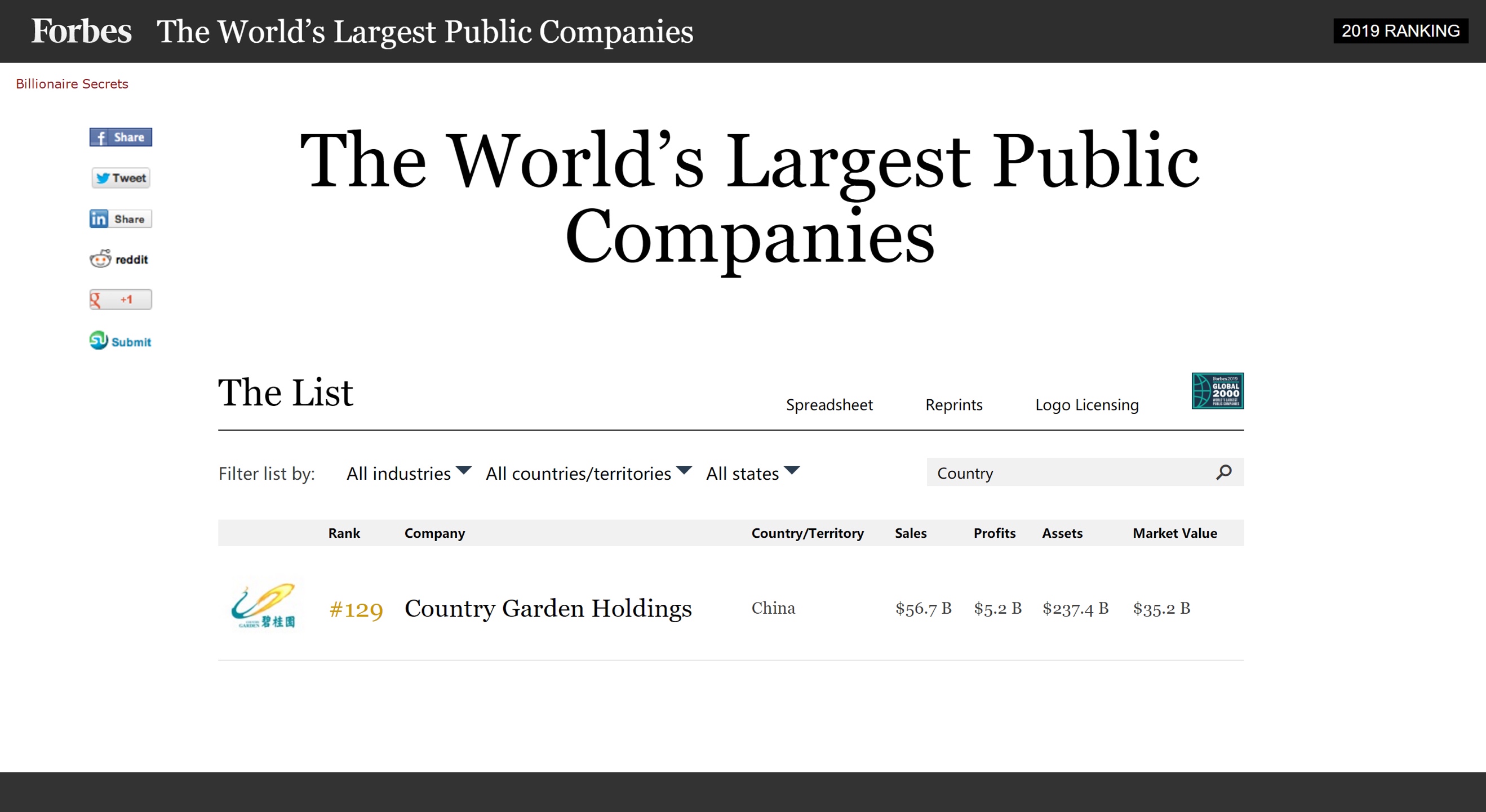 5月16日晚,權(quán)威商業(yè)雜志 《福布斯》發(fā)布了2019年全球上市公司2000強(qiáng)榜單。其中,中國(guó)龍頭房企碧桂園(02007.HK)已連續(xù)10年上榜,且排名逐年上升,最新排名升至第129位。
