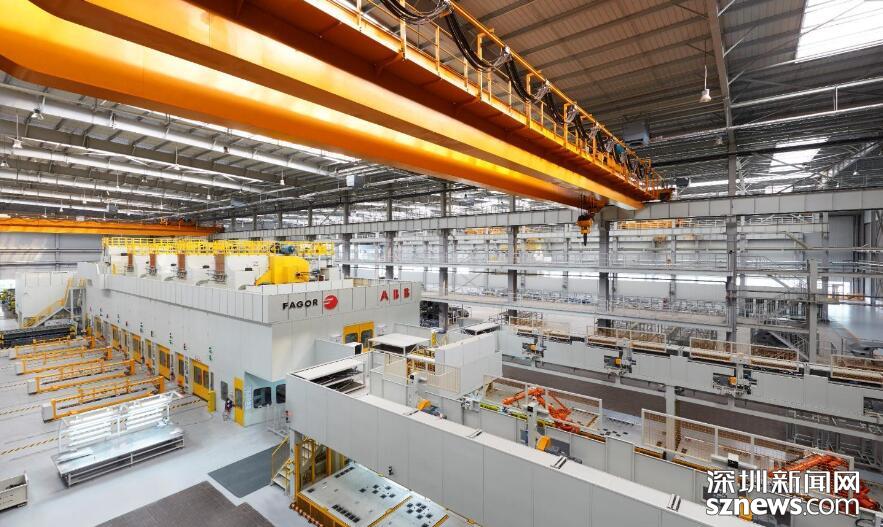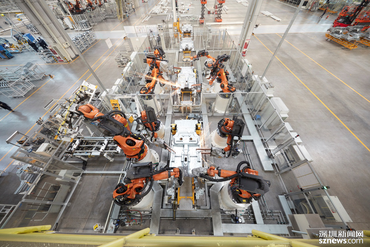 車身車間總占地面積9.9萬㎡,采用互聯(lián)機(jī)器人、柔性NC定位系統(tǒng)、柔性夾具切換系統(tǒng)、自動化輸送系統(tǒng),標(biāo)準(zhǔn)化工藝體系、三層環(huán)網(wǎng)智能管理系統(tǒng)、國際安全標(biāo)準(zhǔn),主線自動化率95%;采用柔性智能生產(chǎn)線,在同一條生產(chǎn)線可完成8個不同的車型無節(jié)拍損失自動切換和混線生產(chǎn)。