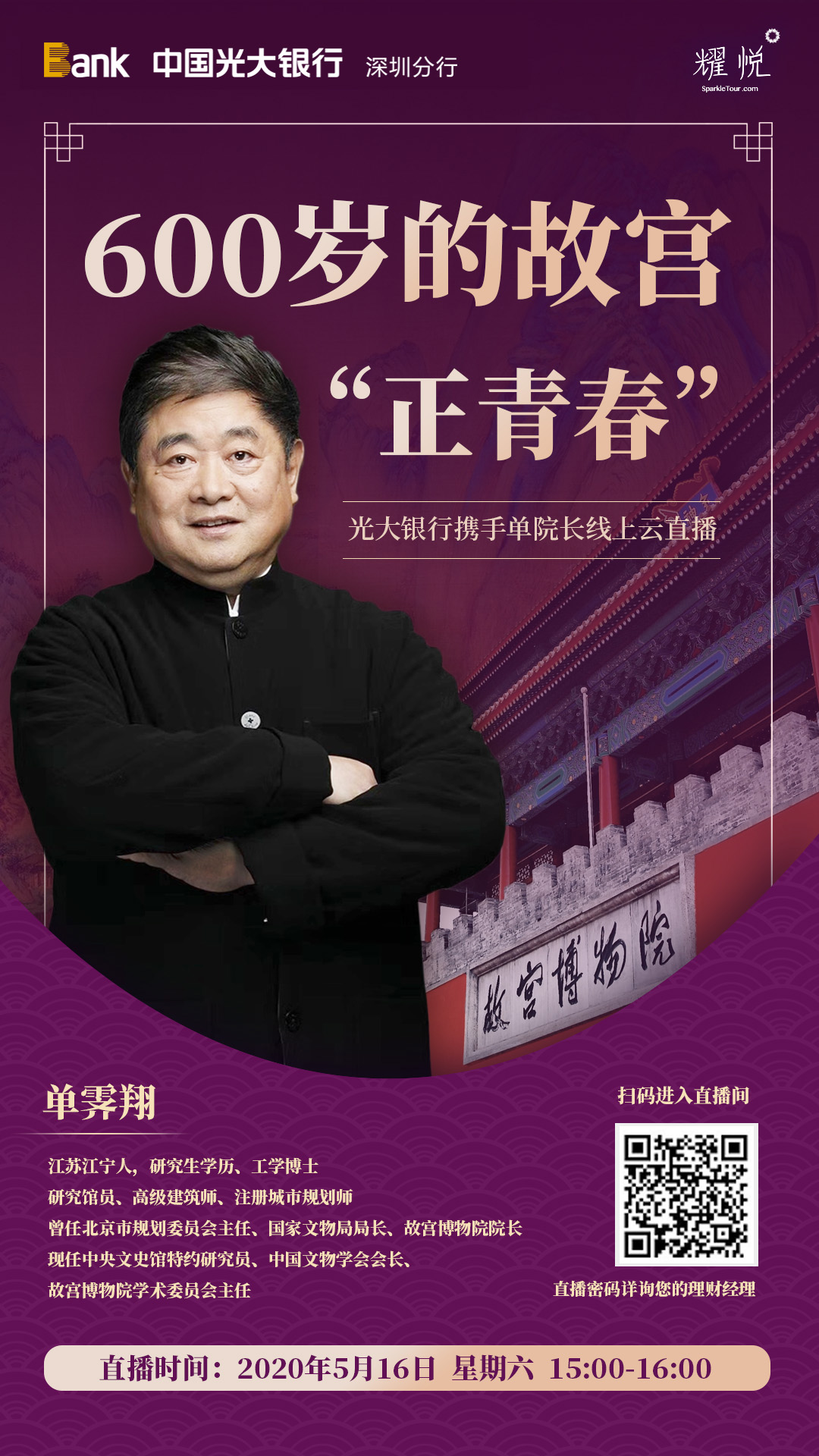 深圳新聞網(wǎng)2020年5月15日訊 他要來了,帶著600歲故宮的青春故事來了,來到《光大銀行“開講啦”!》第十二期。為了回饋客戶,讓廣大客戶更深入體會(huì)到故宮之美,光大銀行深圳分行特邀請?jiān)蕦m博物館單霽翔院長,于5月16日(周六)下午3點(diǎn)-4點(diǎn)線上開講精彩課程《600歲的故宮“正青春”》,讓參與者從多個(gè)角度體驗(yàn)傳統(tǒng)文化之美。