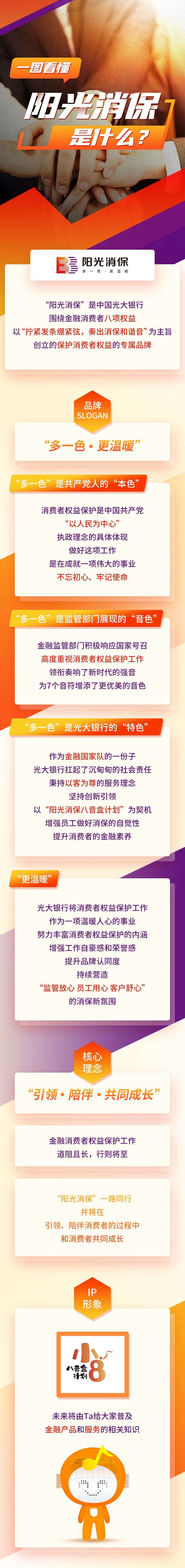 中國(guó)光大銀行“陽(yáng)光消保”品牌標(biāo)識(shí),貫徹了“一個(gè)光大”的品牌管理原則,突出了金融消費(fèi)者權(quán)益保護(hù)與銀行現(xiàn)有業(yè)務(wù)的依存及拓展關(guān)系,在全面貫通現(xiàn)有服務(wù)基礎(chǔ)上,針對(duì)金融消費(fèi)者權(quán)益的“八項(xiàng)基本權(quán)益”,向全社會(huì)做出了“引領(lǐng)·陪伴·共同成長(zhǎng)”的莊嚴(yán)承諾。