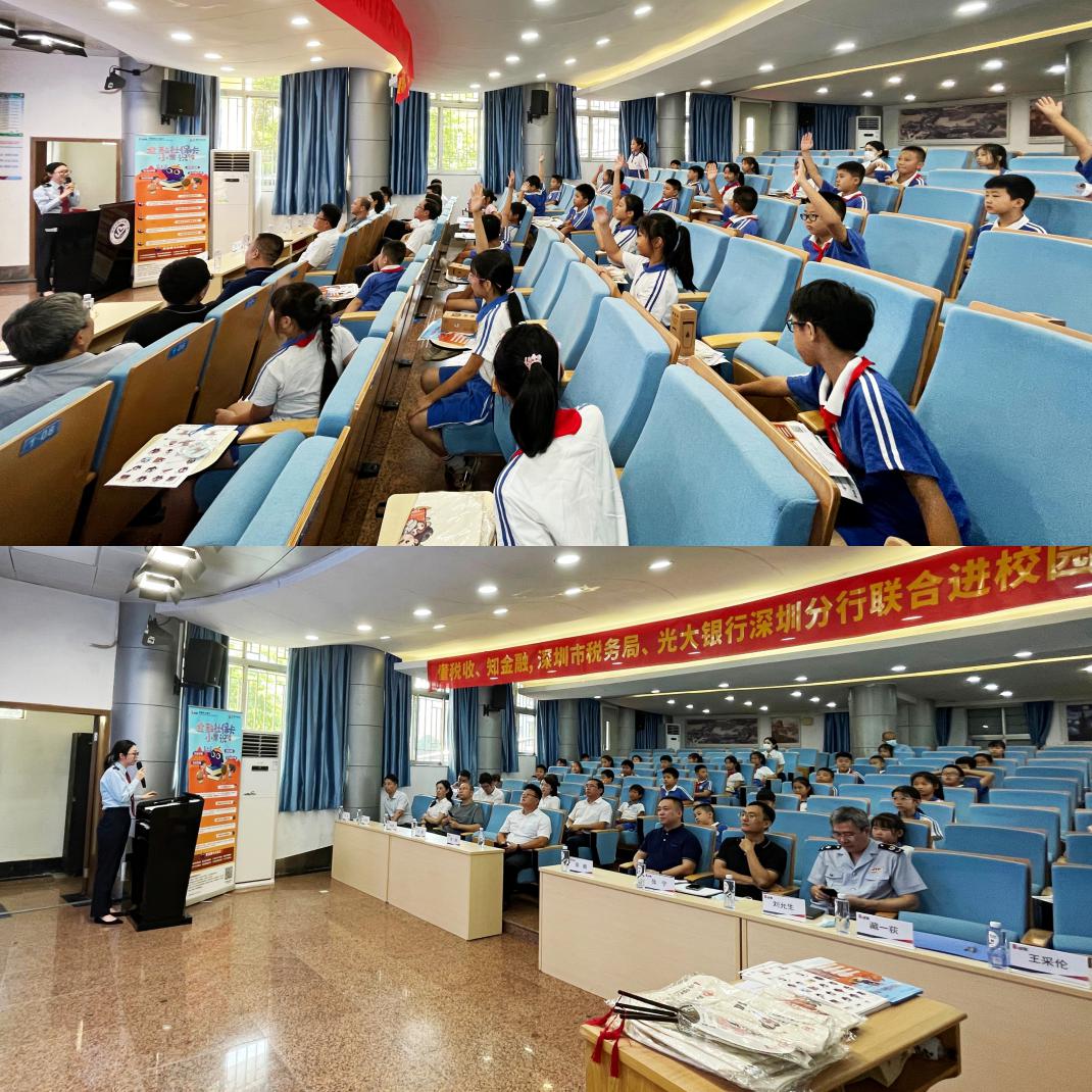 此次活動深圳市稅務局黨委與光大銀行深圳分行黨委高度重視,光大銀行深圳分行副行長、黨委委員宋綱、深圳市稅務局社會保險費處處長高鵬出席活動,旨在以2021-2022年度少兒醫(yī)保征收為契機,讓孩子們從小培養(yǎng)依法納稅、自覺參保意識,同時普及金融知識,關(guān)注青少年思想道德教育,提升金融安全防范意識,履行社會責任?;顒忧?,光大銀行深圳分行副行長宋綱、深圳市稅務局社會保險費處處長高鵬分別對青少年送出了寄語,希望通過銀、稅、校合作,建立社保、金融知識傳輸通道,讓孩子們將稅務、社保、金融知識帶回家。