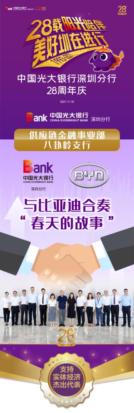 作為光大銀行深圳分行首批成立的支行之一,八卦嶺支行是服務比亞迪的“第一線”。一個個服務實體經濟、相伴成長的動人故事,成為八卦嶺支行代代相傳的寶貴財富。在深圳分行28周年“十大最美光陰故事”評選中,供應鏈金融事業(yè)部與八卦嶺支行榮獲支持實體經濟杰出代表。