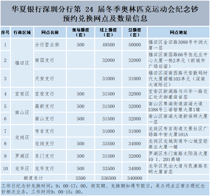 華夏銀行深圳分行共10家網(wǎng)點(diǎn)承辦冬奧紀(jì)念鈔發(fā)行工作。為方便老年客戶預(yù)約紀(jì)念鈔,該行7家網(wǎng)點(diǎn)開放線下預(yù)約,市民可持有效的第二代居民身份證原件至公告的現(xiàn)場預(yù)約網(wǎng)點(diǎn)辦理預(yù)約。紀(jì)念鈔先到先得,額滿為止。