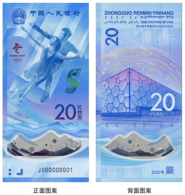 正面圖案:正面主景為花樣滑冰運(yùn)動員圖案,上方為中華人民共和國國徽、“中國人民銀行”行名,左側(cè)為第24屆冬季奧林匹克運(yùn)動會會徽,右側(cè)為光彩光變樂譜圖案、面額數(shù)字“20”與漢字“貳拾圓”,下方為動感全息圖案、透明視窗、盲文面額標(biāo)記和冠字號碼。