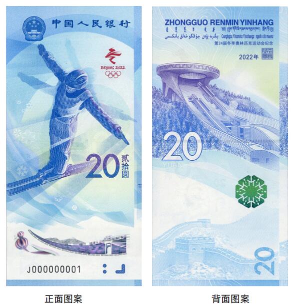 正面圖案:正面主景為自由式滑雪運(yùn)動員圖案,上方為中華人民共和國國徽、“中國人民銀行”行名,右側(cè)為第24屆冬季奧林匹克運(yùn)動會會徽、面額數(shù)字“20”與漢字“貳拾圓”,下方為動感全息圖案、盲文面額標(biāo)記和冠字號碼。