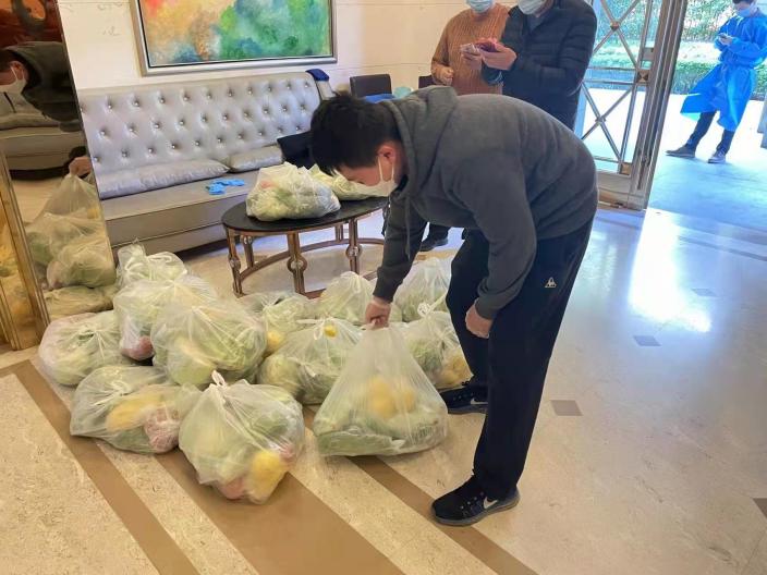 上圖:黃天馳幫助樓棟分發(fā)物資