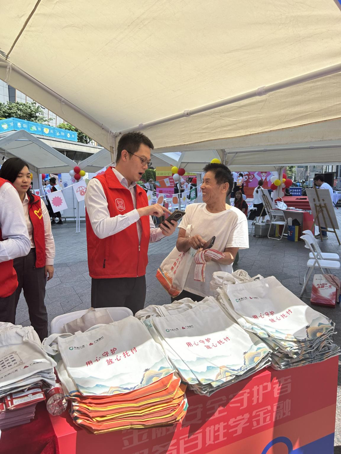 廣發(fā)銀行深圳分行紀(jì)委書記杜經(jīng)濤向現(xiàn)場群眾發(fā)放宣傳購物袋