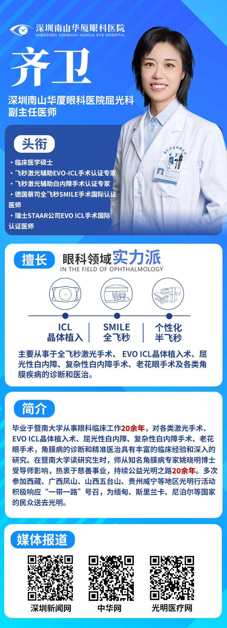 畢業(yè)于暨南大學的齊衛(wèi)主任,師從知名角膜病專家姚曉明博士,從求學時起就對眼科事業(yè)的熱愛。臨床工作中,而且她在激光手術(shù)、EVO ICL 晶體植入術(shù)、屈光性白內(nèi)障手術(shù)等領(lǐng)域積累了深厚造詣。
