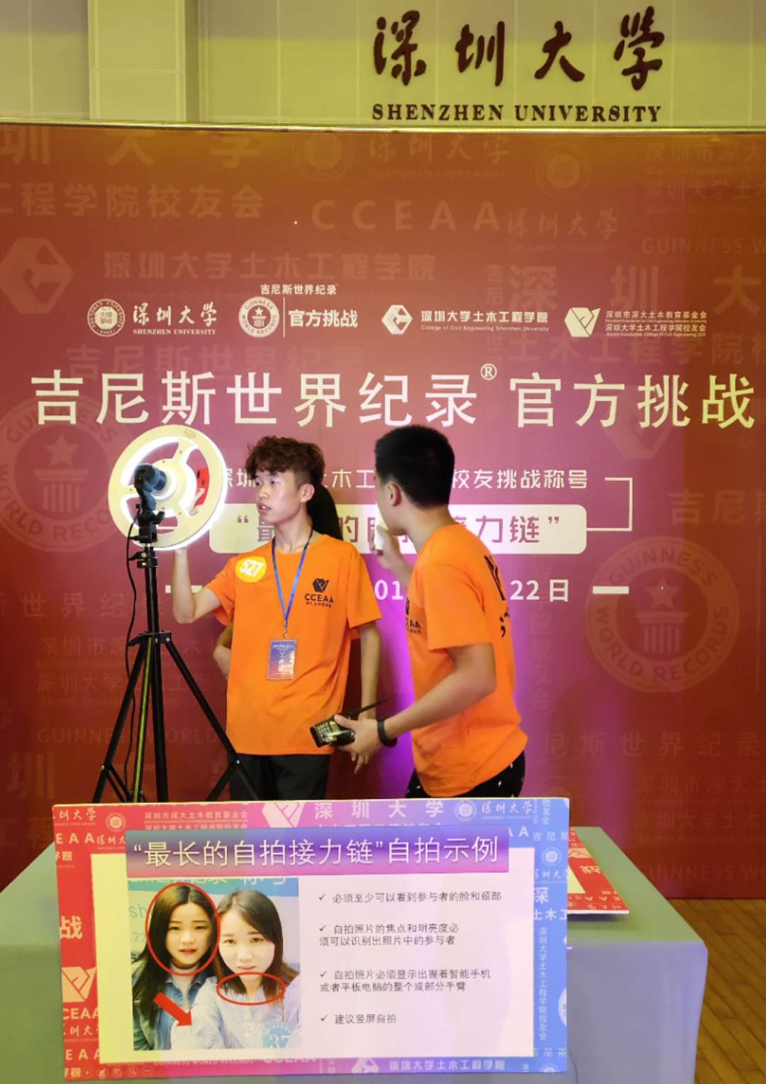 據(jù)悉,為慶祝今年深圳大學(xué)建校35周年,深大土木工程學(xué)院與深大土木工程學(xué)院校友會聯(lián)合組織師生、校友,挑戰(zhàn)“最長的自拍鏈條”吉尼斯世界紀(jì)錄挑戰(zhàn)活動。當(dāng)天所有的自拍照片也將集合形成深圳大學(xué)LOGO,永久留存深圳大學(xué)檔案館,獻禮深大35周年校慶。校友企業(yè)永鑫集團、南利裝飾、中德誠投資、深大巨成、龍影、大勝得特、特藝達裝飾、深建安工程對此次吉尼斯世界紀(jì)錄官方挑戰(zhàn)活動提供了支持。