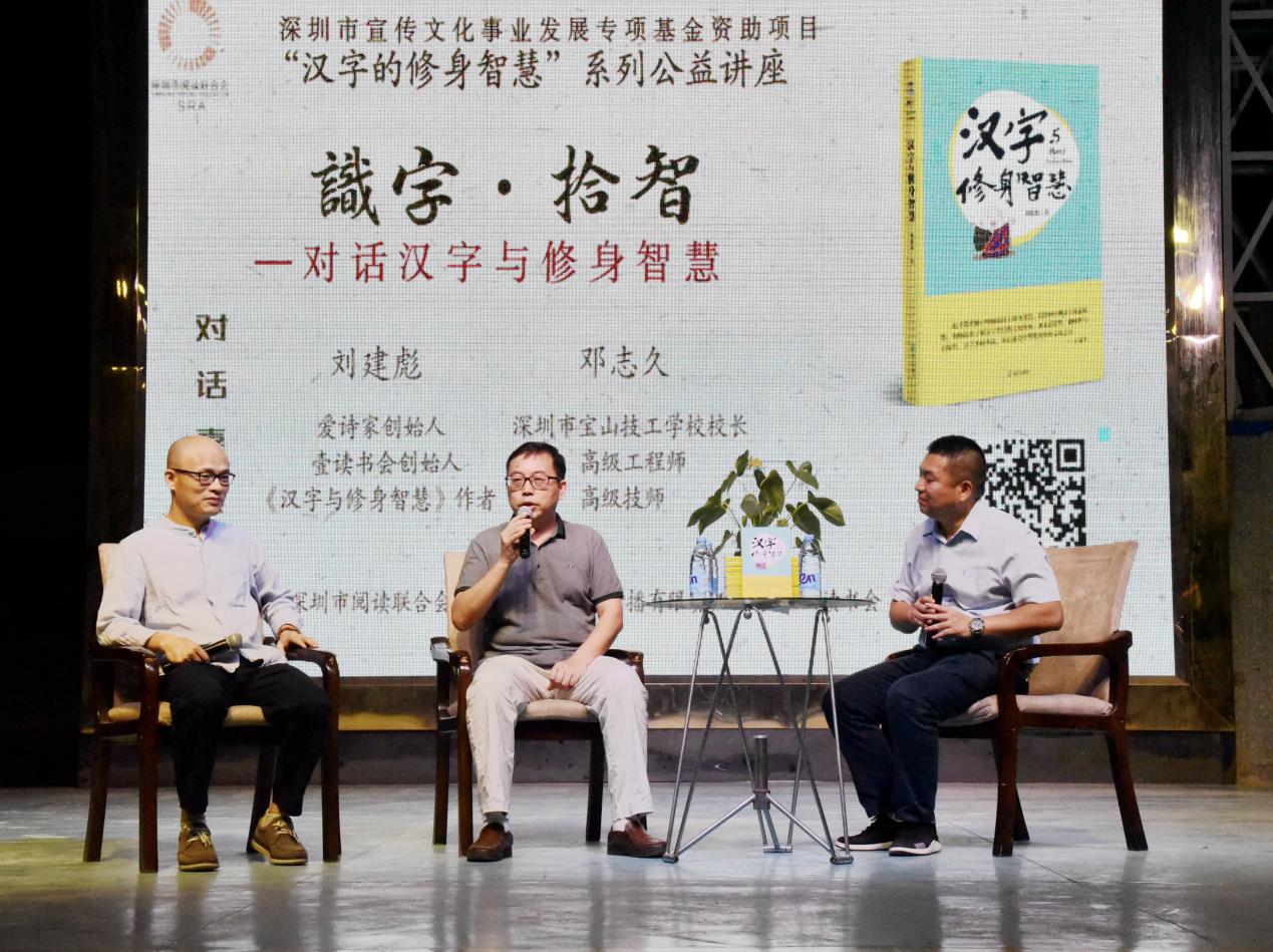 深圳新聞網(wǎng)訊 9月18日晚上7時,由深圳市閱讀聯(lián)合會、深圳市壹書文化傳播有限責(zé)任公司和寶山讀書會共同主辦的“‘識字拾智’——對話漢字與修身智慧”公益文化講座在寶山技工學(xué)校寶山大舞臺拉開了序幕。據(jù)悉,這是由深圳市宣傳文化事業(yè)發(fā)展專項基金資助項目“漢字的修身智慧”的第三場公益文化講座,以劉建彪《漢字與修身智慧》新書分享為契機,傳播漢字正能量,讓更多的青少年識字長智,領(lǐng)略漢字文化之精妙。