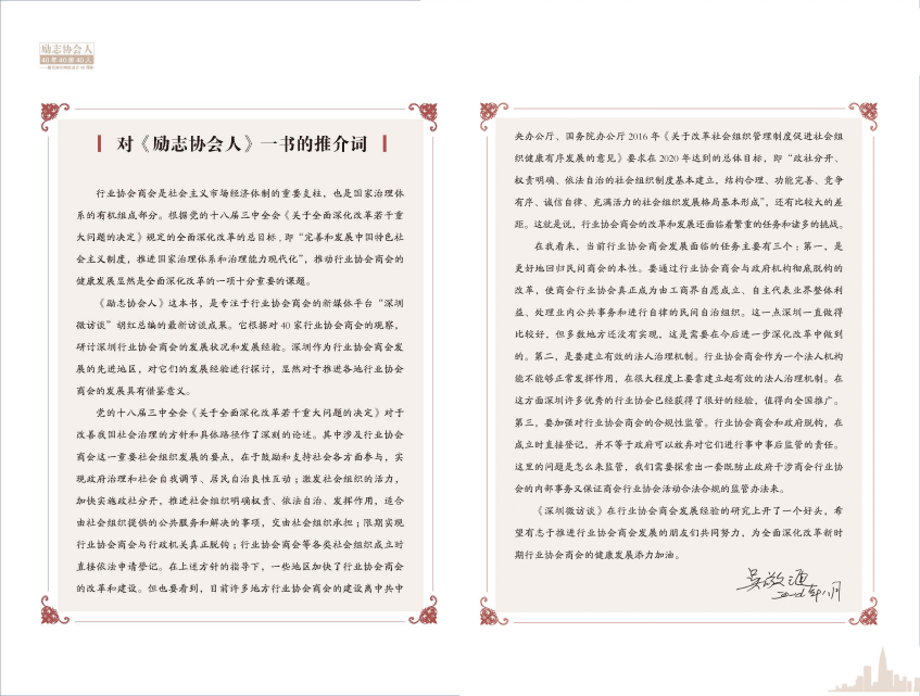 清華大學公益慈善研究院王名教授為此書作序中寫道:感謝深圳,孕育出了中國改革開放和市場經(jīng)濟發(fā)展中最發(fā)達的協(xié)會;感謝深圳的協(xié)會,為一批優(yōu)秀的協(xié)會人提供了人生和事業(yè)的舞臺。