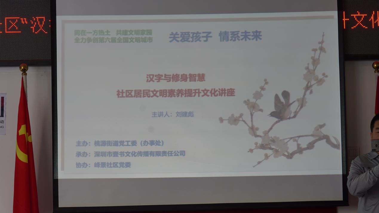 11月8日下午,該項(xiàng)目首場(chǎng)講座在峰景社區(qū)工作站拉開了序幕,本次講座由桃源街道黨工委(辦事處)主辦、深圳市壹書文化傳播有限責(zé)任公司承辦、峰景社區(qū)黨委協(xié)辦,邀請(qǐng)到壹讀書會(huì)創(chuàng)始人、知名閱讀推廣人、《漢字與修身智慧》的作者劉建彪擔(dān)任主講嘉賓。在深圳爭(zhēng)創(chuàng)全國(guó)文明城市的當(dāng)下,桃源街道辦積極響應(yīng)市委市政府的號(hào)召,不斷探索籌劃、推陳出新,以“‘同在一方熱土共建文明家園’——全力爭(zhēng)創(chuàng)第六屆全國(guó)文明城市”為文明創(chuàng)建標(biāo)語,開展題為“學(xué)習(xí)漢字與修身智慧,以傳統(tǒng)文化力量促文明”的文化講座,為創(chuàng)建文明城市貢獻(xiàn)一份力量。