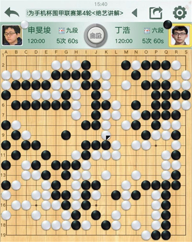 陶欣然執(zhí)白對陣鄔光亞。黑棋右邊攻擊白棋時候,連續(xù)失誤,反被白棋妙手吃通棋筋,黑已無法逆轉局面。有意思的是,賽前陶欣然遲到2分鐘被罰2分鐘,但絲毫不影響他獲勝。