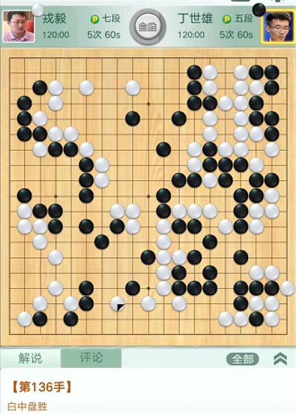 第三臺慢棋,由深圳隊(duì)戎毅七段執(zhí)白對陣衢州隊(duì)丁世雄五段。開局右下角變化黑棋虧損。之后白棋右上角試應(yīng)手時(shí),黑棋選擇脫先吃白中間殘子失誤。白棋棄掉幾子在右上黑空先手活出,大幅領(lǐng)先。之后白棋安全運(yùn)轉(zhuǎn)直至終局,戎毅執(zhí)白中盤勝丁世雄。