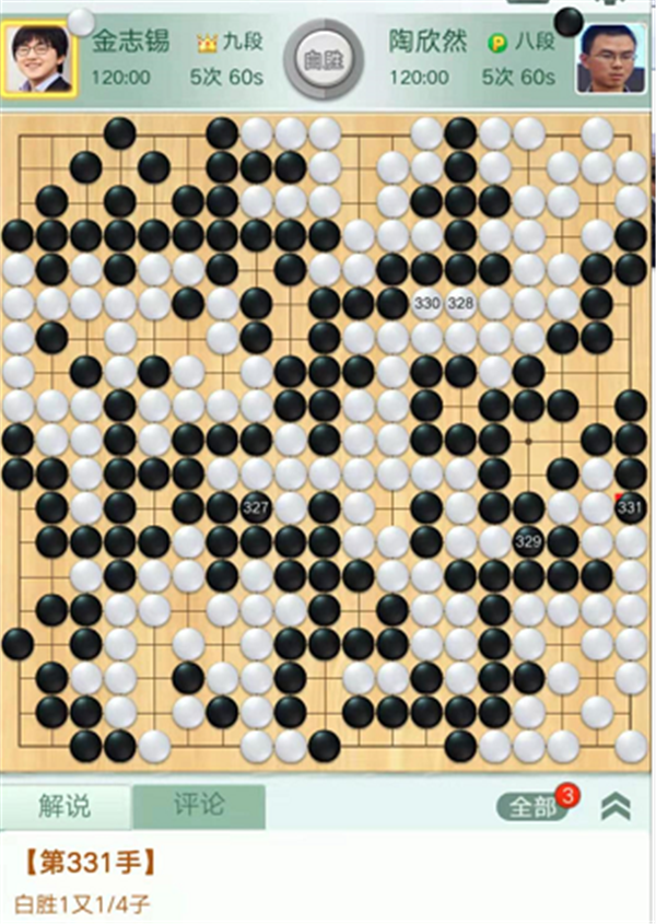 第二臺主將臺,由深圳隊(duì)陶欣然八段執(zhí)黑對陣衢州隊(duì)韓國外援、世界冠軍金志錫九段。開局下方戰(zhàn)斗雙方各有失誤,局面依然均勢。之后左上角形成打劫,白棋棄劫右上打穿黑空各有所得。黑棋攻擊左上角白棋時(shí)候白棋應(yīng)對失誤,黑棋取得領(lǐng)先。白棋看到形勢不利放出勝負(fù)手,打入上邊黑空過分,黑棋反擊后白棋極其危險(xiǎn)。關(guān)鍵時(shí)候黑棋鼠標(biāo)點(diǎn)錯,給自己留下一個斷點(diǎn),被白棋活出后,局面難以挽回,陶欣然執(zhí)黑1又1/4子負(fù)金志錫。