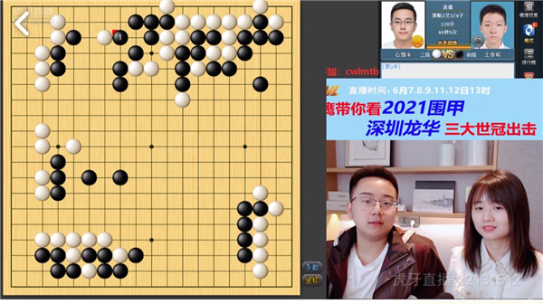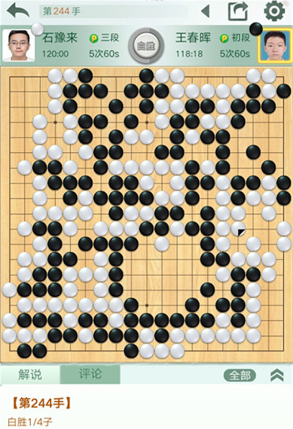 石豫來執(zhí)白對陣小將王春暉。雙方錯進錯出,最終黑棋小官子出現問題,白棋幸運1/4子獲勝。