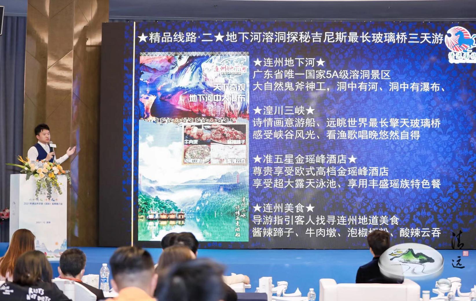 文化是旅游的靈魂,旅游是文化的載體。近年來,清遠(yuǎn)依托自然資源稟賦和深厚的文化底蘊(yùn),多措并舉推動文旅融合發(fā)展,文旅產(chǎn)業(yè)呈現(xiàn)欣欣向榮局面?,F(xiàn)場,清遠(yuǎn)市珠水美悅酒店管理有限公司總經(jīng)理宋玉亮、清遠(yuǎn)市古龍峽生態(tài)旅游娛樂有限公司營銷專員林嘉儀、清遠(yuǎn)市愛地旅游發(fā)展有限公司營銷經(jīng)理?xiàng)钍婧?、清遠(yuǎn)市國業(yè)旅游開發(fā)有限公司常務(wù)副總經(jīng)理韓勇,依次以圖文并茂、聲畫結(jié)合的形式,推介了美林湖景區(qū),古龍峽景區(qū),連州地下河、湟川三峽、龍?zhí)犊蜅?、擎天玻璃橋、連州大酒店,峰林曉鎮(zhèn)、洞天仙境,讓與會人員身臨其境感受山水清遠(yuǎn)的魅力;清遠(yuǎn)市國旅國際旅行社有限責(zé)任公司業(yè)務(wù)總監(jiān)李國華則現(xiàn)場推介了古龍峽云天玻霸兩天游、地下河溶洞探秘及吉尼斯最長玻璃橋三天游等5條精品旅游線路,現(xiàn)場“種草”清遠(yuǎn)眾多網(wǎng)紅打卡點(diǎn)。
