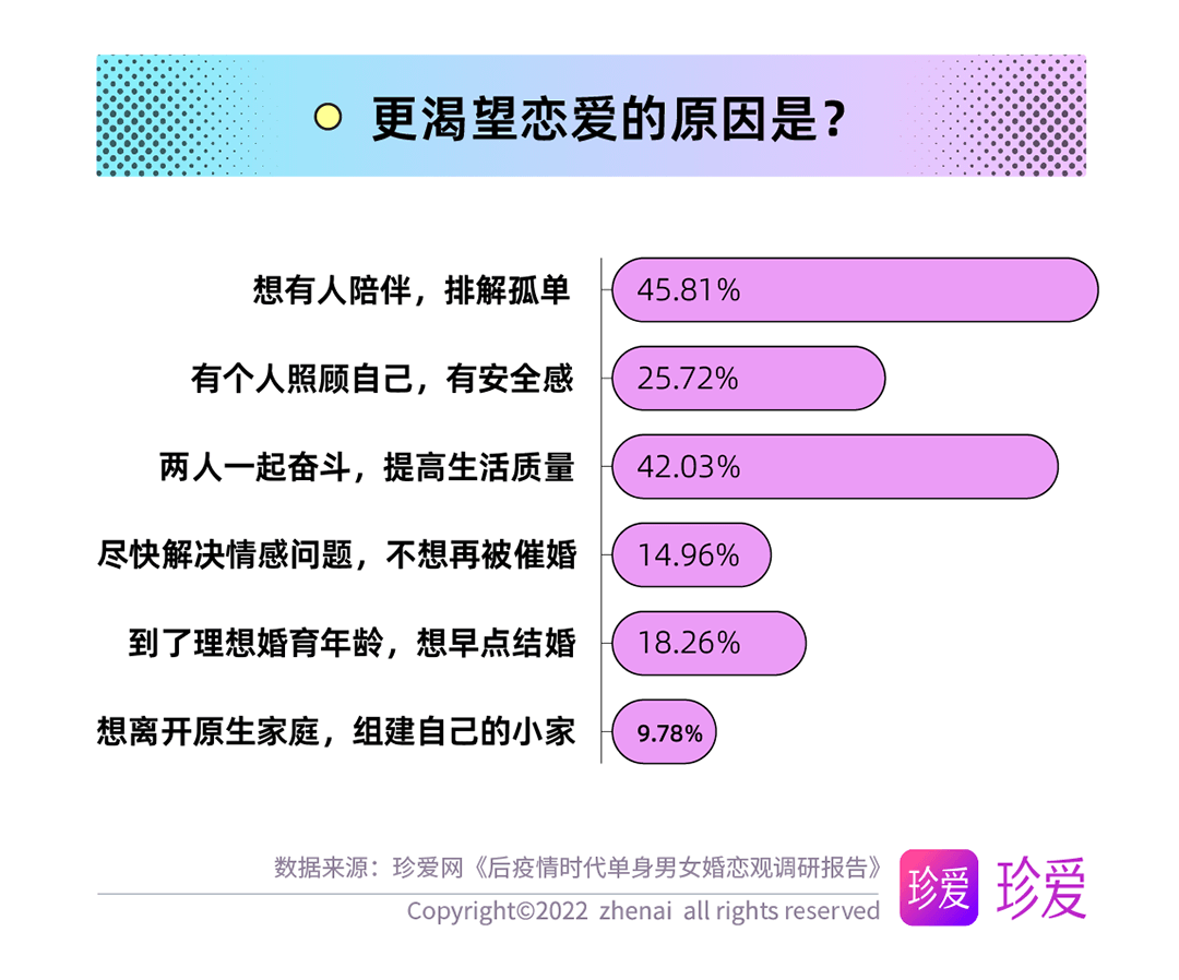66.54%的單身青年在經(jīng)歷了疫情后更加渴望美好的愛情,希望體驗(yàn)愛與被愛、尋求另一半陪伴、兩人共同努力以改善生活是他們期待脫單的主要原因。年輕人對(duì)脫單的期待值有著更顯著的提升,并且是出于更加現(xiàn)實(shí)和理性的考量——20 -35歲的單身青年們渴望脫單的首要原因是希望找到一位與自己并肩奮斗的伴侶,提升生活質(zhì)量;35歲以上的受訪者更注重愛情的感性價(jià)值,把享受愛情、體驗(yàn)愛與被愛放在首位。