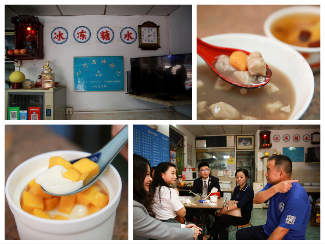在禮賓司的引領(lǐng)下,大家來到已有千年歷史的文化遺產(chǎn)——南頭古城。一行人在“九街糖水鋪”入座,店主夫妻倆熱情的端出清甜可口的化州糖水和香氣四溢的潮州炒米粉,和我們嘮起了家長里短。大家方才得知,這宛如尋常百姓家的糖水鋪竟開業(yè)于1995年,見證了古城九街的變遷翻新和故去新來的幾代人潮川流。帶著傳播化州糖水美名初衷的糖水世家選擇在深圳發(fā)家,傳到這已是第三代。眾人大快朵頤,禮賓司也幫忙跑堂添茶。