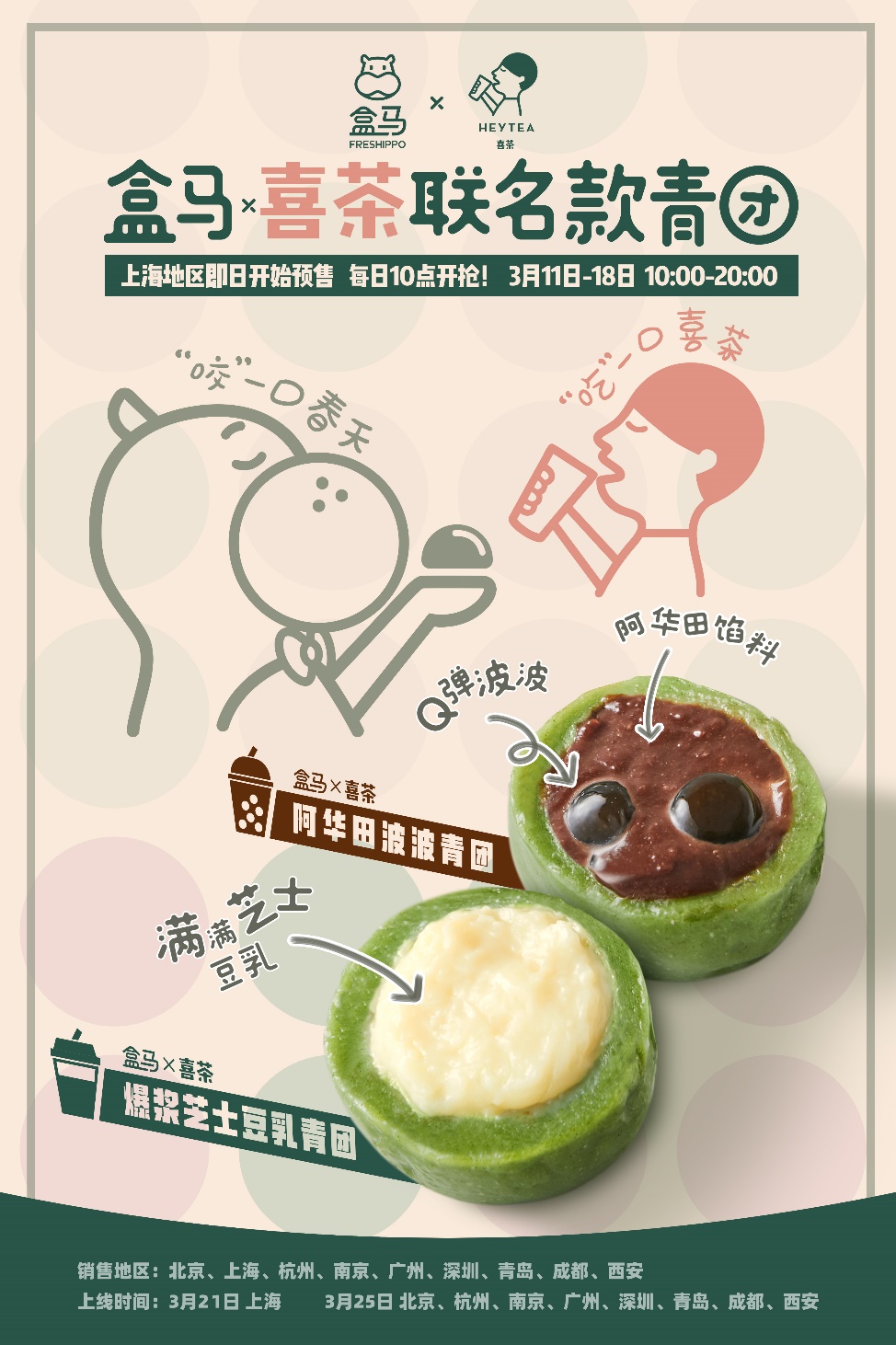 據(jù)了解,盒馬×喜茶聯(lián)名青團(tuán)于3月11日開啟上海地區(qū)的預(yù)售,3月21日將正式上線。北京、杭州、南京、廣州、深圳、青島、成都、西安等地將于3月25日上線,屆時消費者可通過盒馬線上下單,30分鐘就能吃上春天的味道。