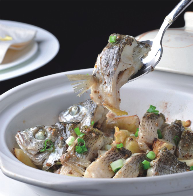 廣東人也會(huì)把立魚叫做“黃腳立”,立魚生長(zhǎng)很慢,脂肪含量低,絲毫不見(jiàn)肥膩,最討女仔喜歡。立魚如果清蒸,則肉質(zhì)偏韌;雷大廚改以鹽焗,用砂鍋爆香姜蔥蒜,魚肉先經(jīng)鹽、糖、少許油、生粉和胡椒粒撈一撈,下鍋后蓋蓋子焗上五分鐘,入味后經(jīng)砂鍋一焗,緊緊鎖住肉汁。