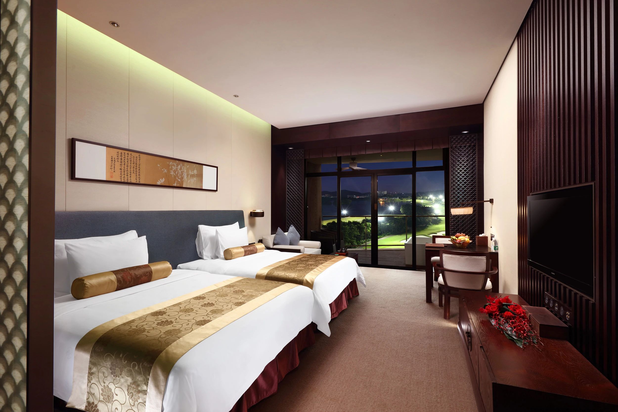 我們這次下榻的是42㎡的豪華客房,以中國風(fēng)為美學(xué)設(shè)計(jì),床頭是韻味十足的古風(fēng)字畫,中式銅鎖、陶瓷擺件……藝術(shù)品無處不在。