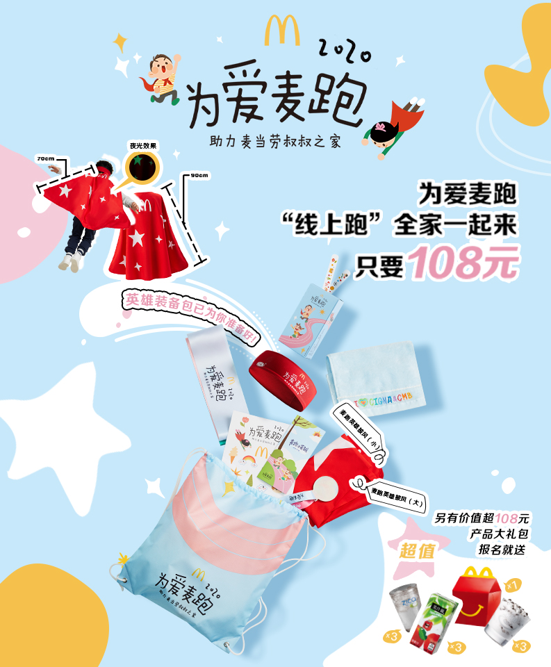 不同于往年大規(guī)模的線下親子跑,今年“為愛麥跑”采用創(chuàng)新的“線上愛心親子跑”,提供裝備包和任務(wù)盒,讓參跑家庭用不聚集、無接觸的形式參與跑步,享受親子時光,并支持麥當(dāng)勞叔叔之家。“為愛麥跑”鼓勵參跑者發(fā)揮創(chuàng)意,以家庭為單位設(shè)定自己的路線和距離,例如以自己的家為起點(diǎn),將終點(diǎn)設(shè)在附近的麥當(dāng)勞餐廳。