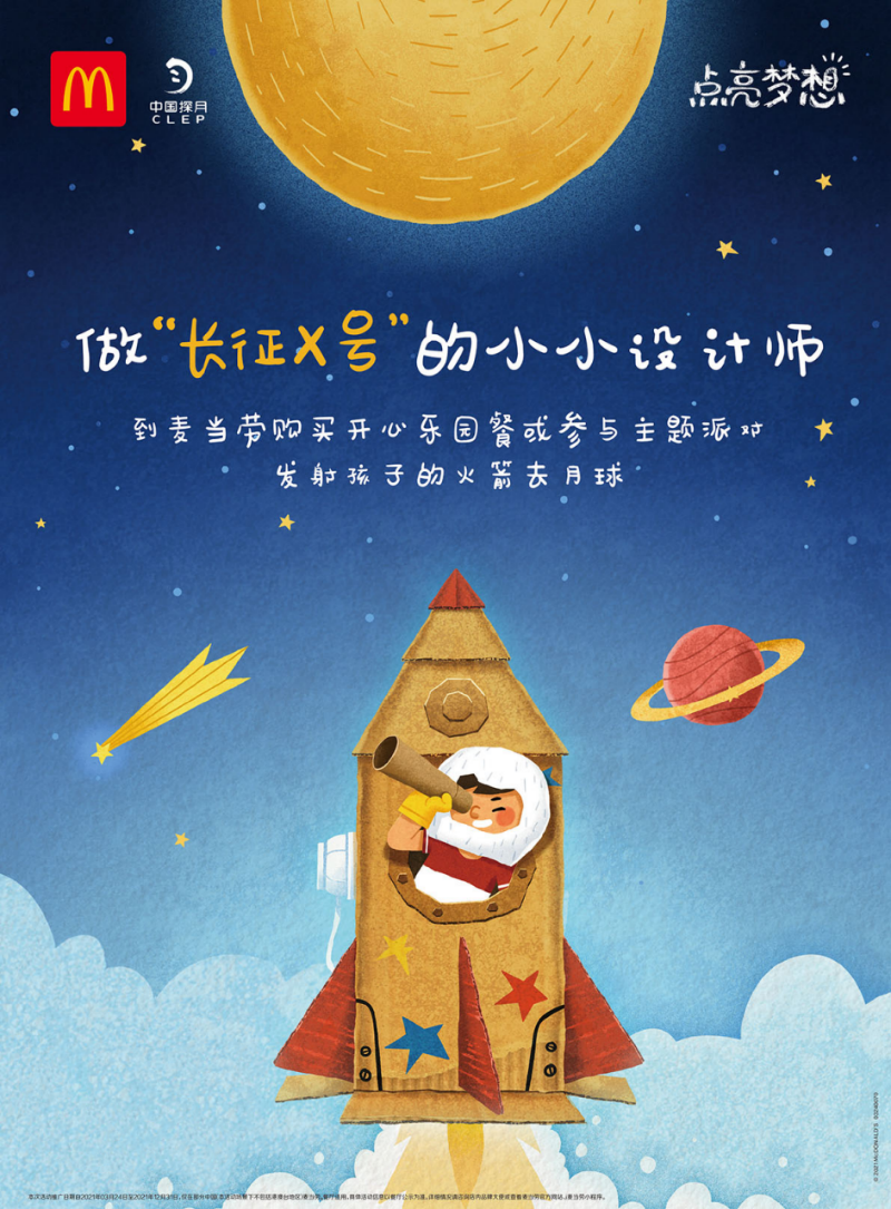 2021點(diǎn)亮夢想活動,是麥當(dāng)勞與中國探月的二度合作,雙方再次聯(lián)合守護(hù)夢想,并鼓勵動手實踐,做到“敢夢敢想敢為”。