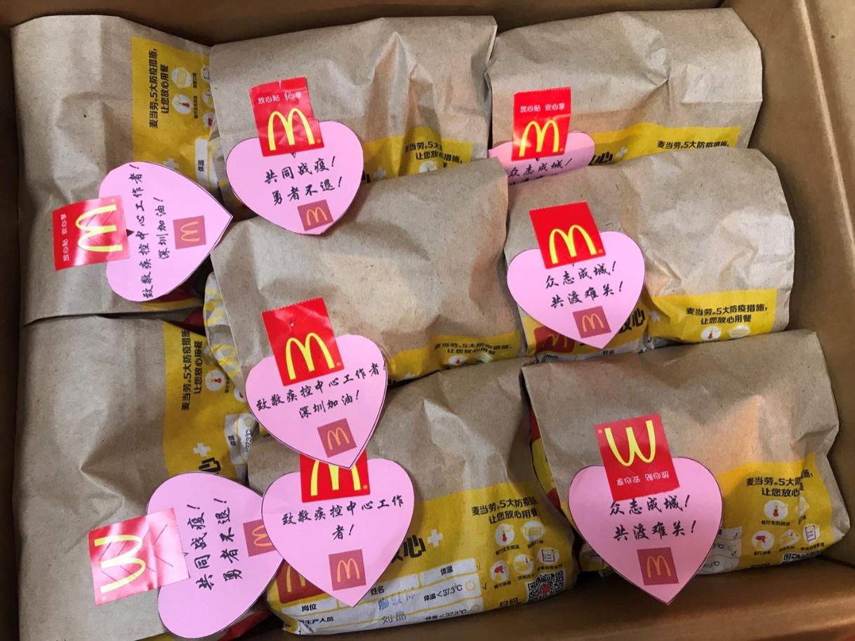 深圳麥當勞“麥麥義工團”小伙伴們向龍崗疾控中心防疫工作一線的醫(yī)護人員贈送愛心餐食