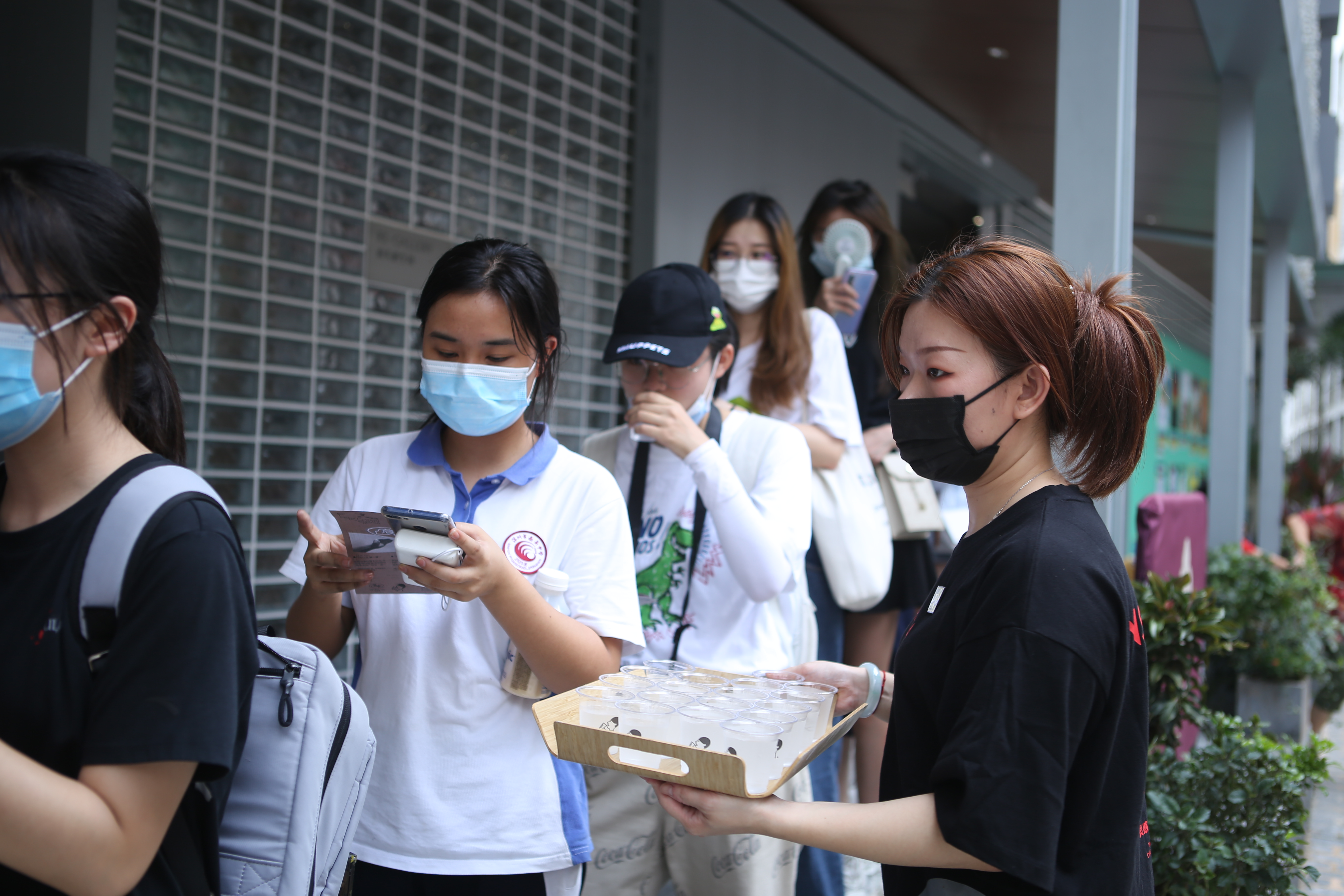 (門(mén)店工作人員熱情地為排隊(duì)顧客送上茶飲解渴)