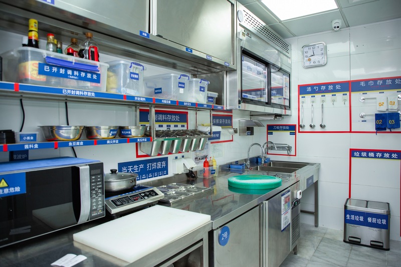 “右手邊是冷菜間,因為食安要求更高,我們都有專門的‘二次更衣室’,在這里更換衣服后,再進入對涼菜進行處理?!必撠?zé)人表示,在專門的涼菜區(qū)里,則可以看到櫥窗中整齊地貼上了諸如“A1圣女果”“B04魚豆腐”之類的標(biāo)簽,同時備注“當(dāng)天生產(chǎn)打烊廢棄”和“加工日期與廢棄日期”等具體操作指示。“每晚打烊后,我們也會用紫外線燈對冷菜間進行半個小時的消毒?!必撠?zé)人補充。