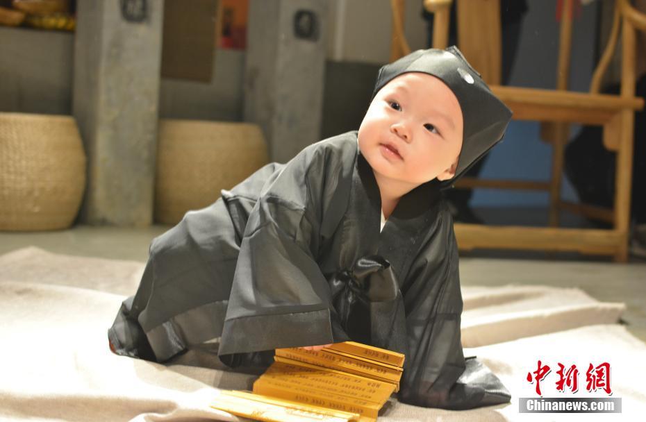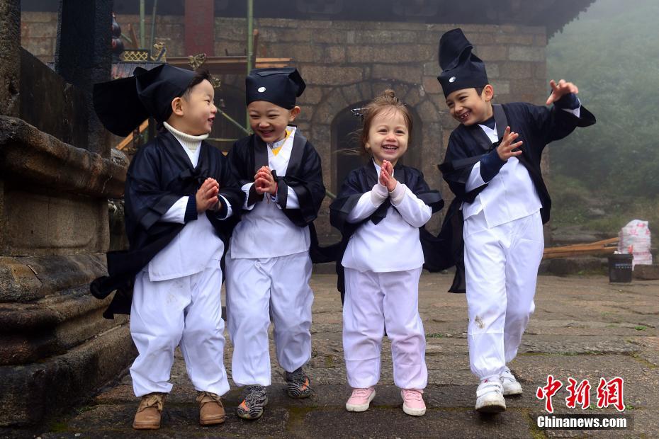 10月16日,在“道教名山”、世界自然遺產地江西上饒三清山,5名來自中外的萌娃身穿統一道服,手持竹簡,在三清宮跟著道教師傅朗讀《道德經》、《弟子規(guī)》,學習太極拳、書法、古箏等中國傳統文化。這群萌娃中年齡最小的僅11個月,年齡最大也只有6歲。程希雪攝