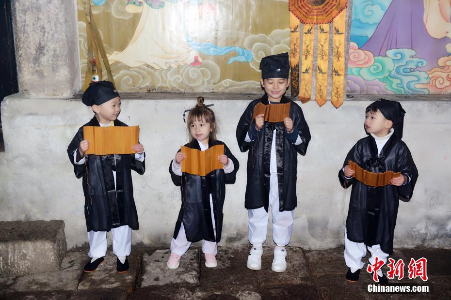 10月16日,在“道教名山”、世界自然遺產(chǎn)地江西上饒三清山,5名來自中外的萌娃身穿統(tǒng)一道服,手持竹簡,在三清宮跟著道教師傅朗讀《道德經(jīng)》、《弟子規(guī)》,學習太極拳、書法、古箏等中國傳統(tǒng)文化。這群萌娃中年齡最小的僅11個月,年齡最大也只有6歲。程希雪攝