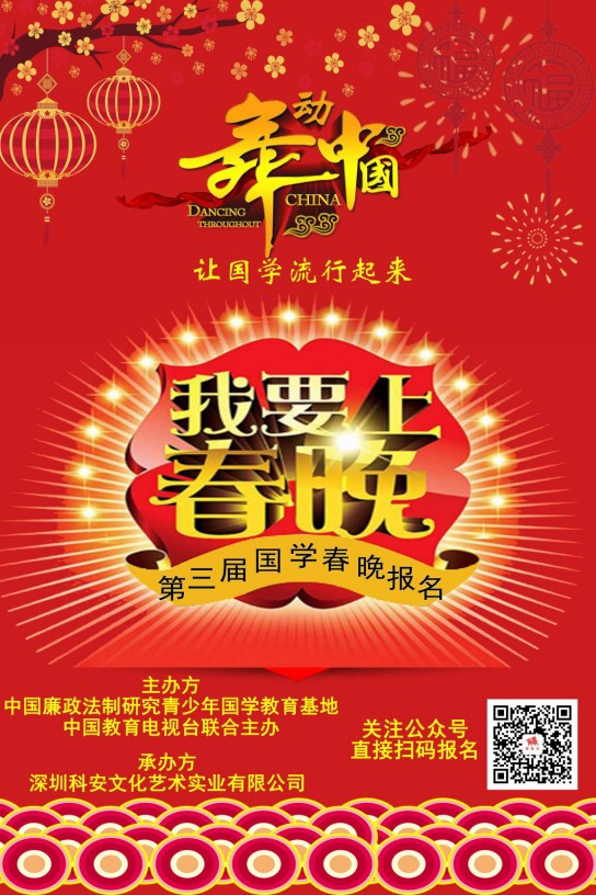 2019年第三屆國學春晚由青少年國學教育基地與中國教育電視臺聯(lián)合主辦,本次春晚打破以往以晚會為主導的籌辦模式,更注重國學文化的推廣及全民國學才藝的選拔。首次以主辦方的報道與宣傳規(guī)模在全國范圍內(nèi)進行海選。以“舞動中國”為主題在全國范圍內(nèi)進行強勢推廣,發(fā)出中國國學文化領(lǐng)域的最強音!在長達4個多月的宣傳活動期間,將不間斷運用活動背景、輻射人群、媒體資源、賽事平臺及網(wǎng)絡優(yōu)勢等方式弘揚國學。