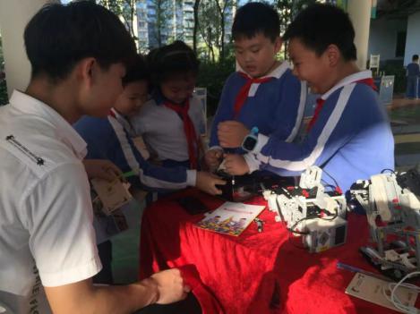 在活動現(xiàn)場,不少智能科技迷正被愛匯百變教育科技有限公司的EV3編程機器人高爾夫、EV3編程機器人幸運大轉盤、EV3編程機器人障礙大闖關、電磁感應千人震等系列體驗活動,通過親身體驗,同學們收獲了LEGO仿真機械結構及圖形化編程、電動發(fā)電、電磁感應、電路等科普知識。