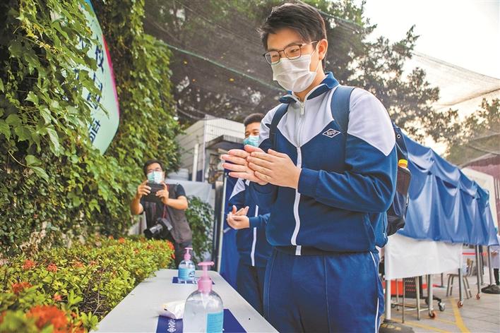 深圳實(shí)驗(yàn)學(xué)校初中部初三學(xué)生進(jìn)校門后自覺消毒洗手。晶報(bào)記者賴?yán)?攝