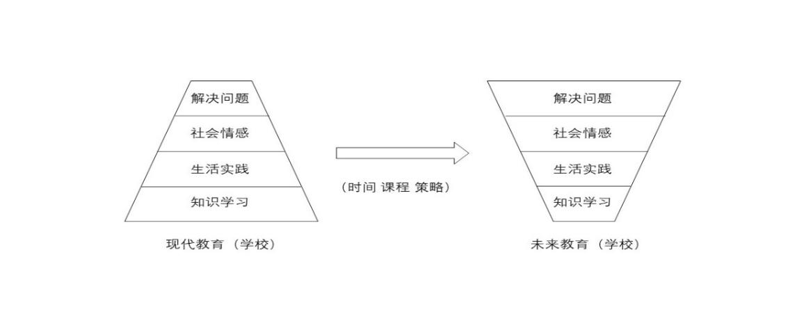 如果說(shuō)未來(lái)教育要超越現(xiàn)代教育,必須把四個(gè)層次的權(quán)重倒置過(guò)來(lái),如圖所示,即從時(shí)間、課程和策略上做根本性的認(rèn)識(shí)和改變。