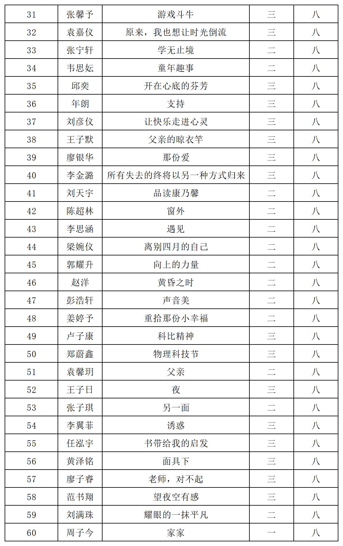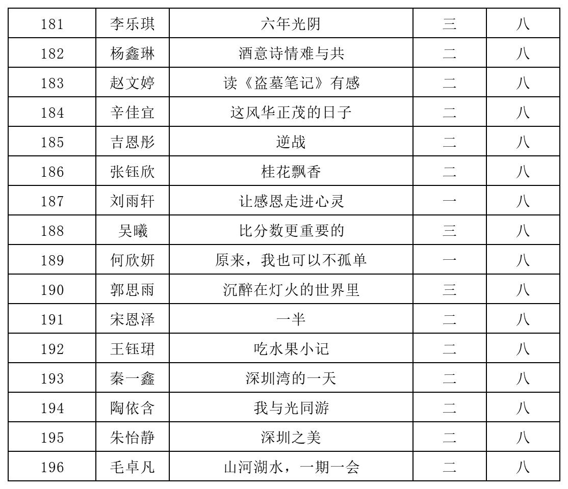 自2021年1月,活動征稿啟動以來,獲得了深圳市廣大中小學(xué)生、教師、文學(xué)愛好者的熱烈響應(yīng)積極參與,吸引了深圳百余所學(xué)校的上萬人關(guān)注報名?,F(xiàn)公布北師大南山附屬學(xué)校中學(xué)部晉級復(fù)賽名單如下: