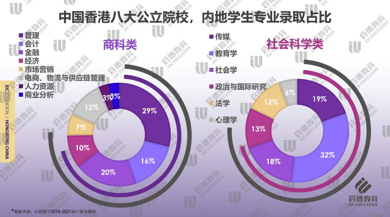 在社會(huì)科學(xué)類(lèi)學(xué)科的細(xì)分專(zhuān)業(yè)中,教育學(xué)(32% )、傳媒(19% )和社會(huì)學(xué)(18% )的錄取占比較高。由于教育類(lèi)專(zhuān)業(yè)在內(nèi)地就業(yè)形勢(shì)好,香港院校不僅教育學(xué)排名靠前,還擁有適合內(nèi)地學(xué)生的中文教育及對(duì)外漢語(yǔ)教育等課程,教育學(xué)專(zhuān)業(yè)在文科生中比重一直居于首位。隨著新媒體行業(yè)的崛起,處于亞洲龍頭地位的香港傳媒專(zhuān)業(yè)也是倍受歡迎。而“公考熱”的持續(xù)使得希望提升學(xué)歷背景的學(xué)生,會(huì)考慮繼續(xù)深造社會(huì)學(xué)、政治與國(guó)際研究此類(lèi)課程。
