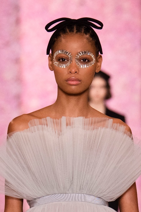 秀場上璀璨奪目的創(chuàng)意水晶元素面部裝飾,均出自化妝師伊莎瑪雅·弗倫奇(Isamaya Ffrench)之手。她選擇了不同尺寸的透明長方平底石和天宇長方平底石,并將它們以畫框的形式點綴在模特眼周,交相輝映出無限純凈光彩。