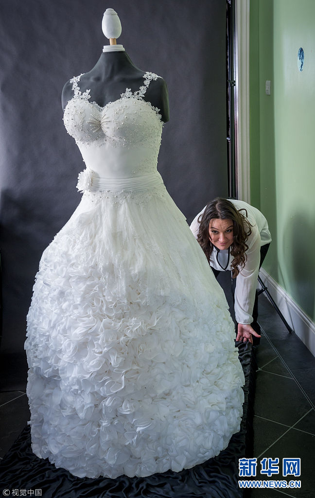 ????2016年4月11日訊(具體拍攝時間不詳),真實尺寸大小的婚紗蛋糕。蛋糕重140斤,高1.7米。它由著名的蛋糕師Sylvia Elba設(shè)計,并由Elba、Yvette Marner、Ilinka Rnic三人整整用了300多個小時方才完成。 (圖片來源:視覺中國)